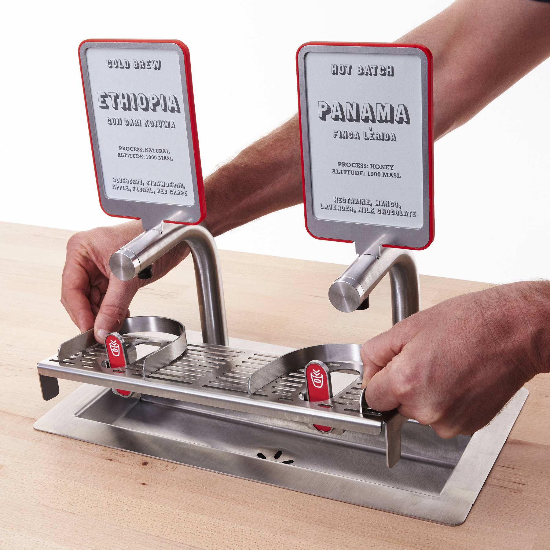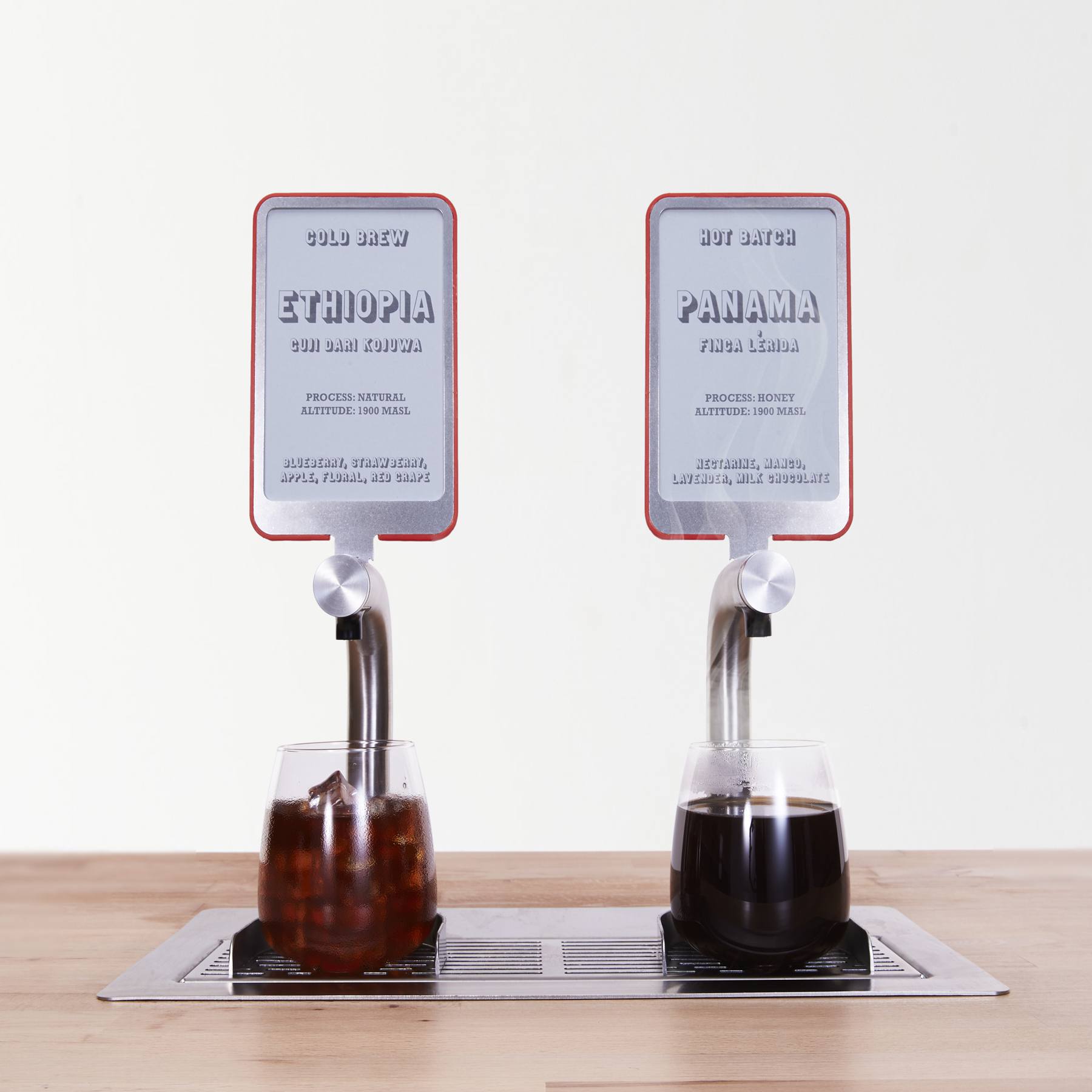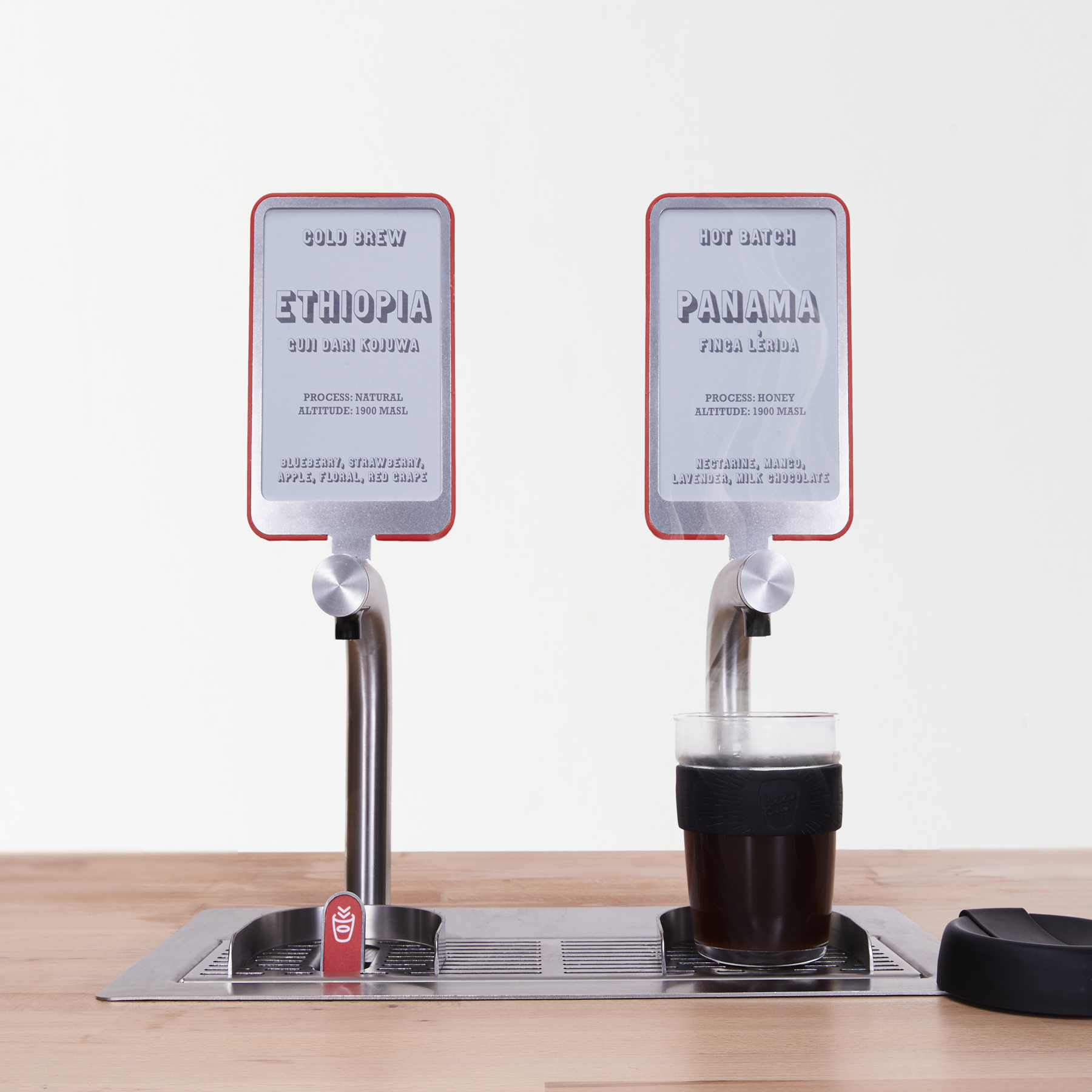 Part of the beauty of serving batch brewed coffee is giving your customer the chance to explore limitless coffee profile possibilities. Signage cards above the taps can be swapped as fast as you change change your mind on which origin you offer next.
