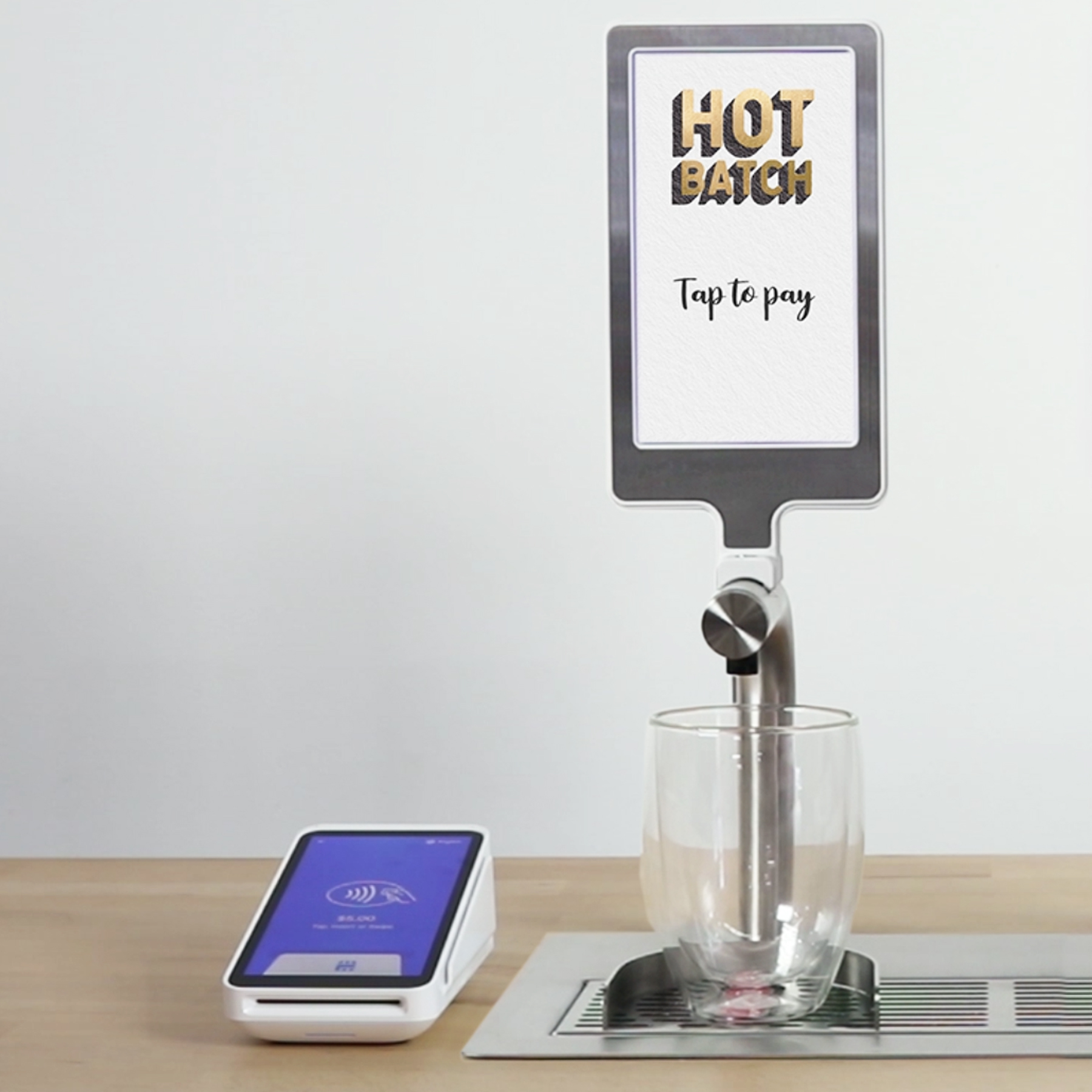 The self-pay option talks to a Square Terminal. Customers can serve and pay for their batch brewed coffee without waiting in the espresso queue. Create graphics that lead customers through the process of selecting, serving and paying.